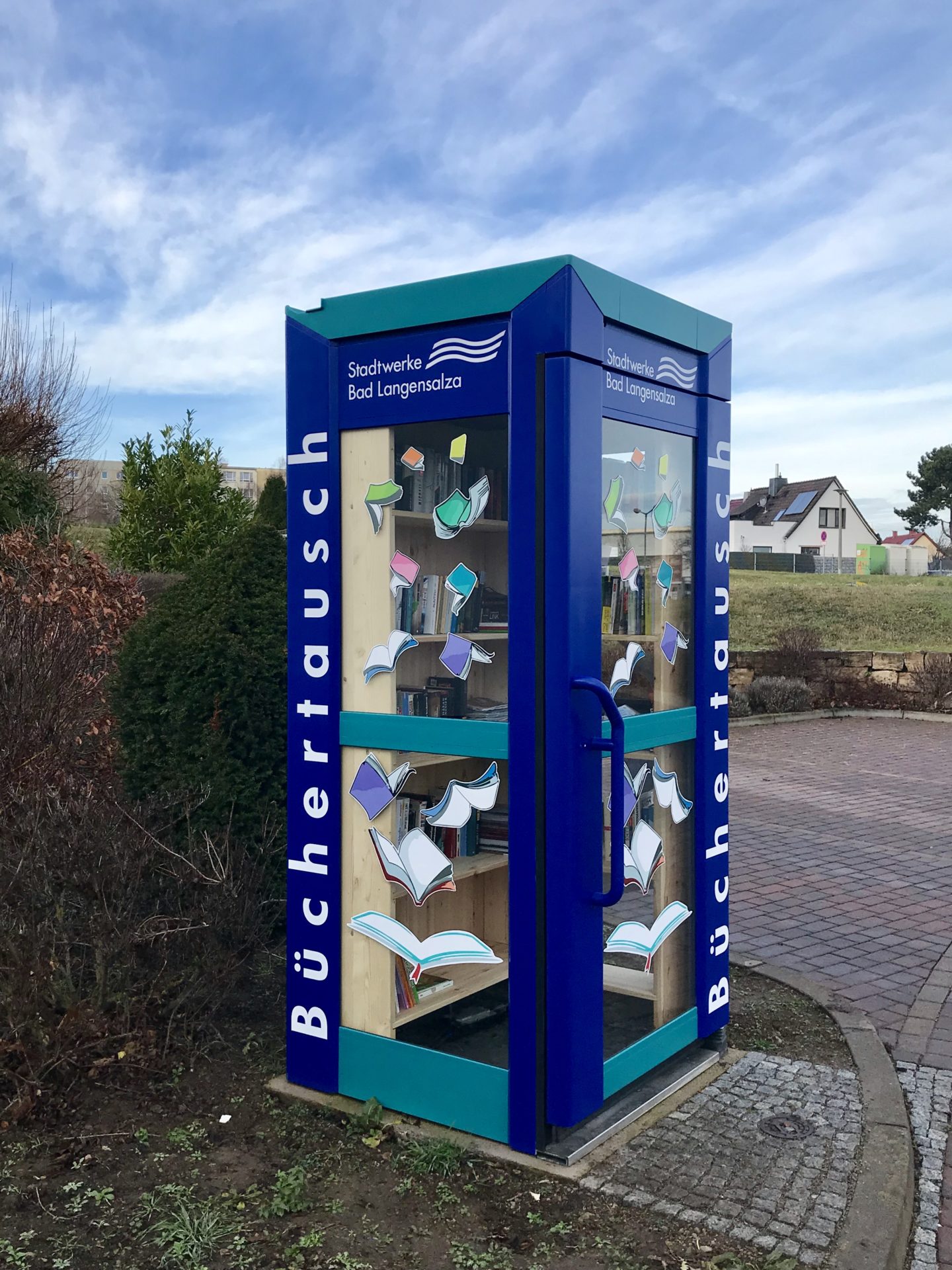 Ein richtiger Blickfang ist unsere umfunktionierte Telefonzelle. Wer in den letzten Tagen den Stadtwerken in Bad Langensalza einen Besuch abstattete, konnte sie nun endlich entdecken – unsere Büchertausch-Telefonzelle direkt neben den Besucherparkplätzen.