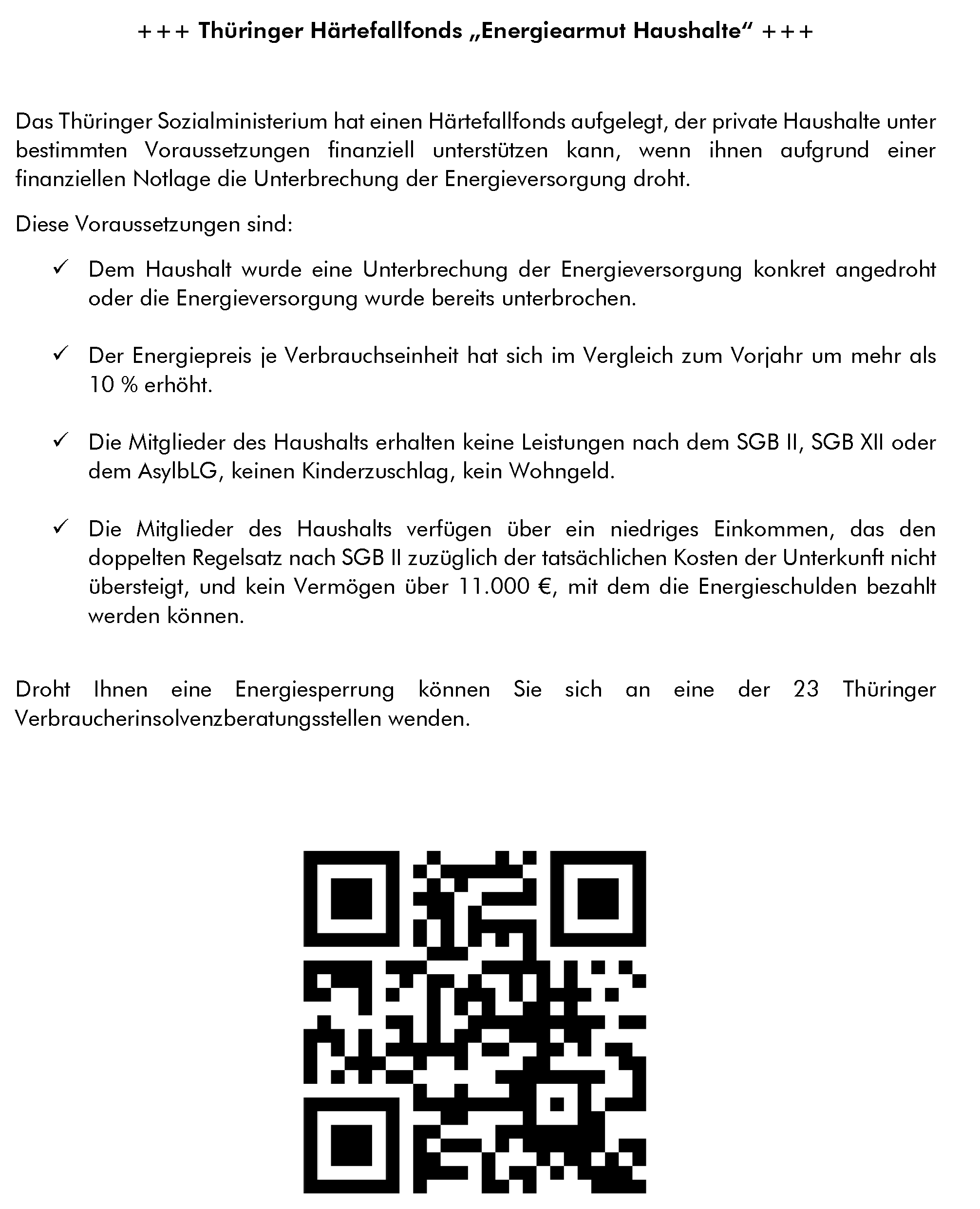 +++ Thüringer Härtefallfonds „Energiearmut Haushalte“ +++ Weitere Informationen finden Sie unter: http://www.tmasgff.de/soziales oder folgen Sie dem QR-Code. Härtefallfonds -Antragsverfahren