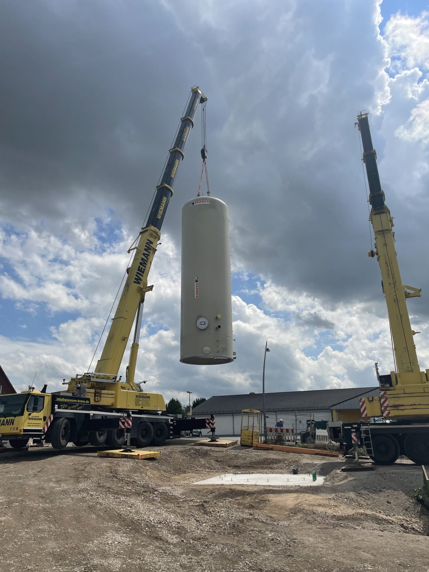 Am Mittwoch, 07.07.2021 erfolgte ein weiterer Meilenstein: Nachdem am Dienstag die Schornsteine geliefert und eingesetzt wurden. Kam ein Tag später der Wärmepufferspeicher der ebenfalls per Kran aufgestellt wurde. Der 15 m lange, fast 5 m im Durchmesser große und 29 Tonnen schwere Koloss steckte auf den Weg nach Bad Langensalza für mehrere Stunden in Gotha fest und kam erst Mittag auf der Baustelle an. Nach Inbetriebnahme kann dieser Behälter 190.000 Liter warmes Wasser speichern und die Fernwärmeversorgung noch gewährleisten, wenn die BHKWs ruhen.